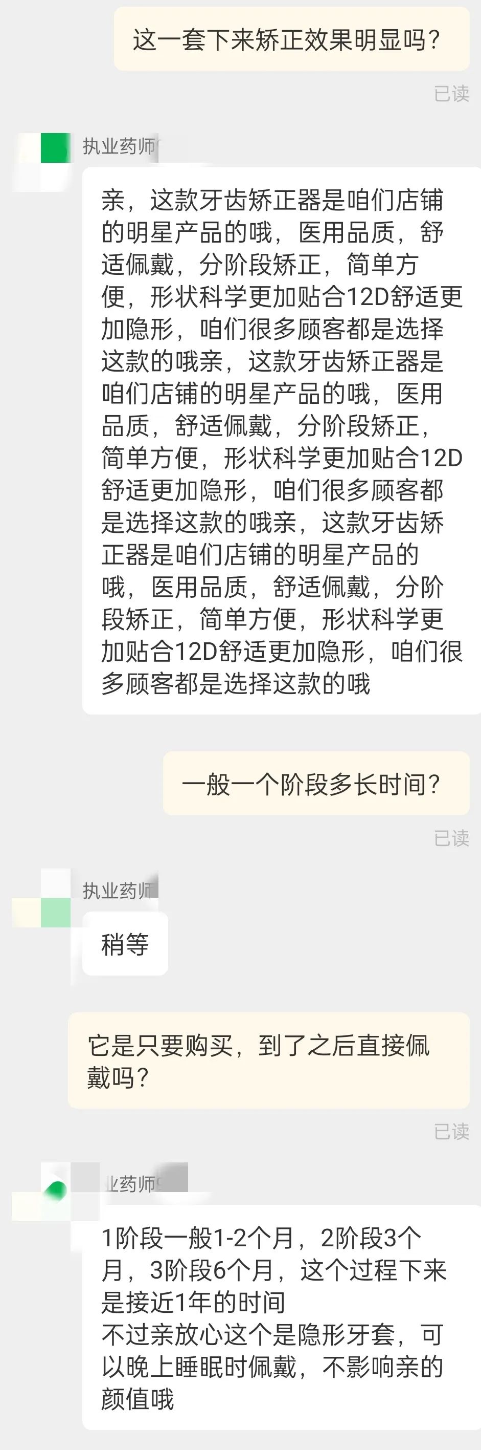 小編點開一家店鋪,客服回答說一般不用讓醫生看診,只要三個階段,而且一箇階段只有一副牙套,三個階段唔超過1年,產品介紹中更係標榜只需晚上訓覺時戴住就得.......